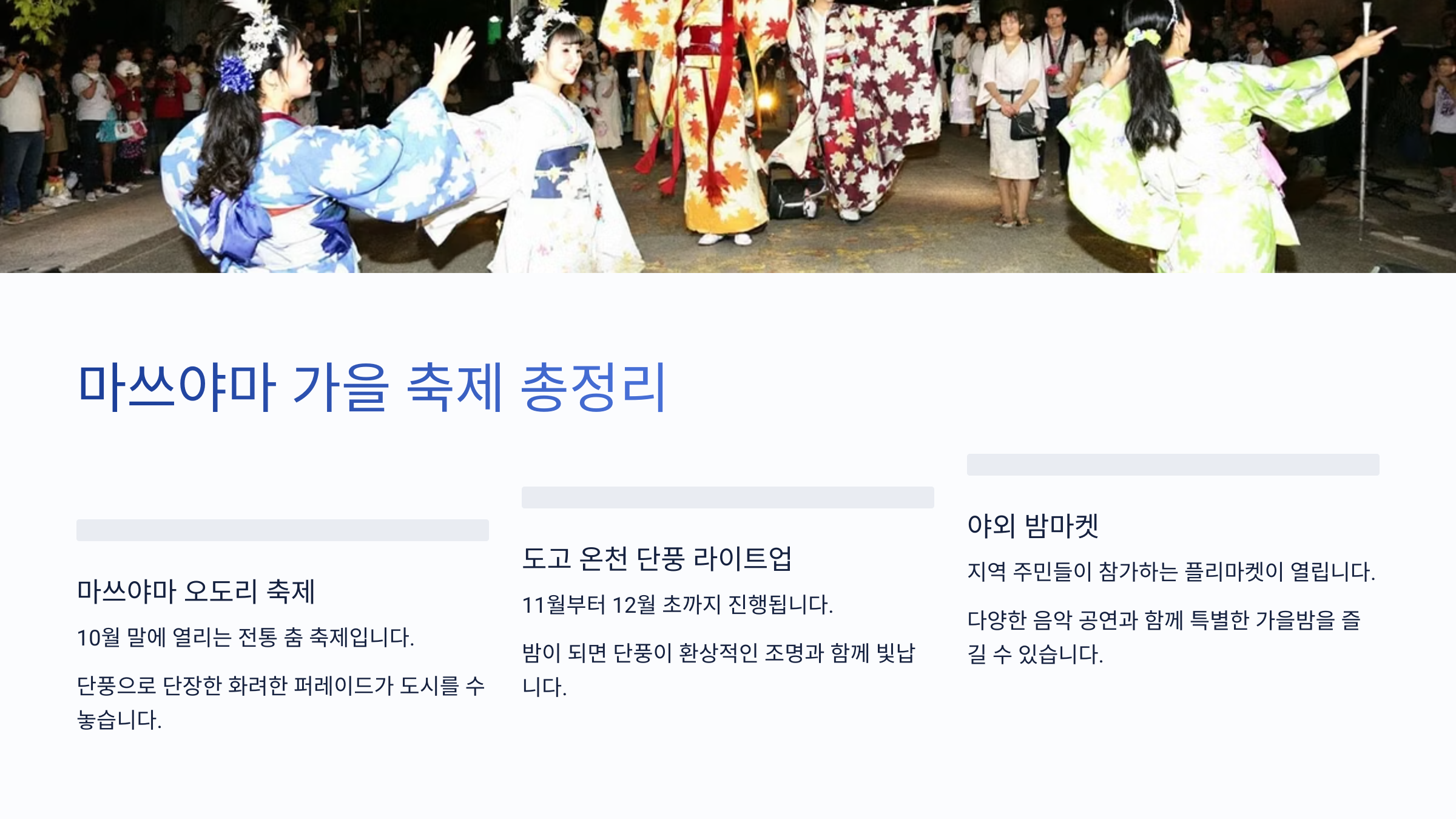 따뜻한 물 속에서 단풍을 바라보는 기분, 말로 다 표현하기 어렵죠. 마쓰야마에서의 가을 온천은 그 자체로 힐링이에요. 그럼 이제 마지막 본문 섹션, 가을 축제 정리로 넘어갈게요! 🎊