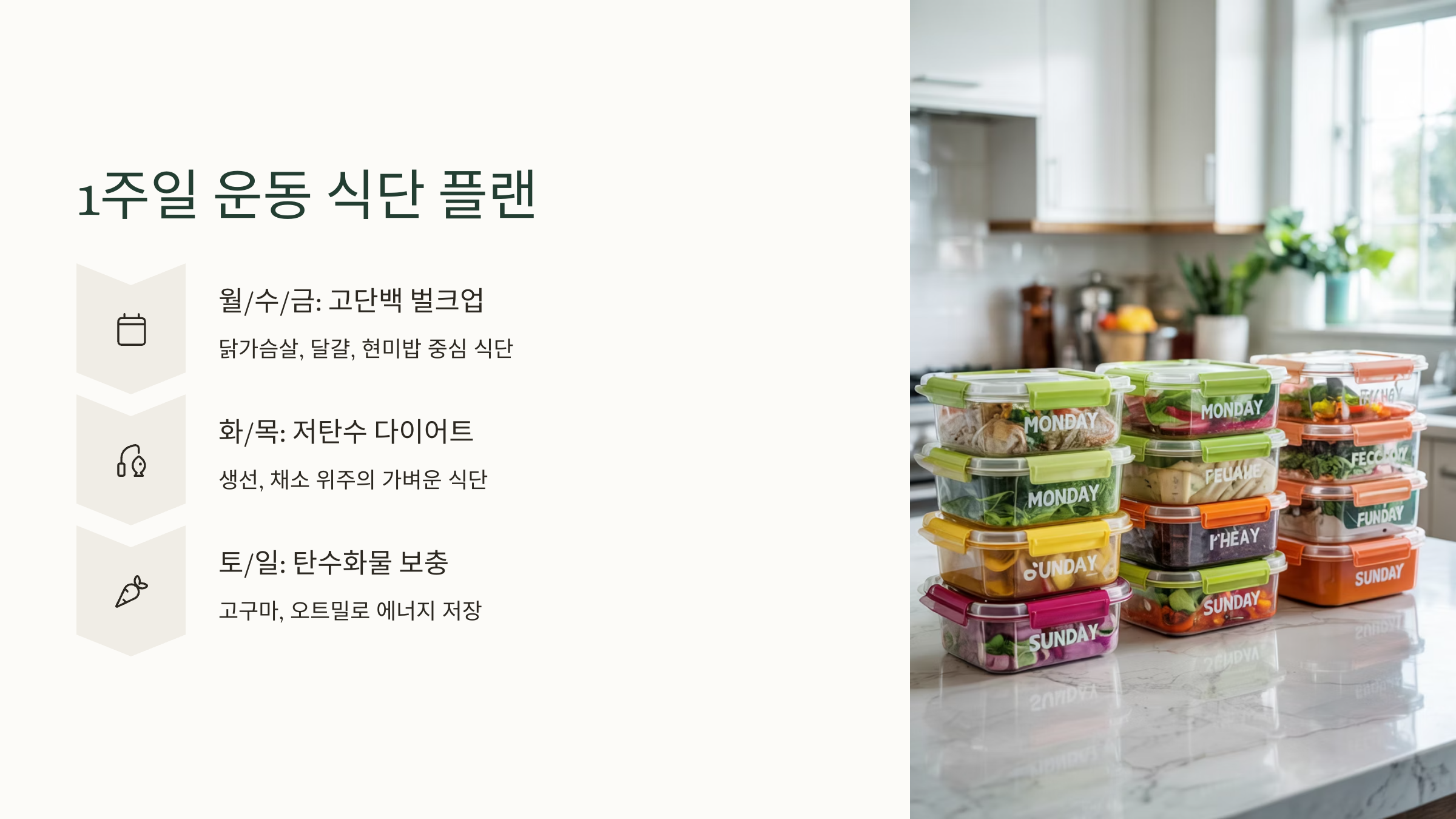 1주일 단위로 운동 식단을 짜면 체계적으로 관리할 수 있어서 결과도 눈에 띄게 좋아져요. 균형 잡힌 단백질, 탄수화물, 지방 배분이 핵심이에요!
