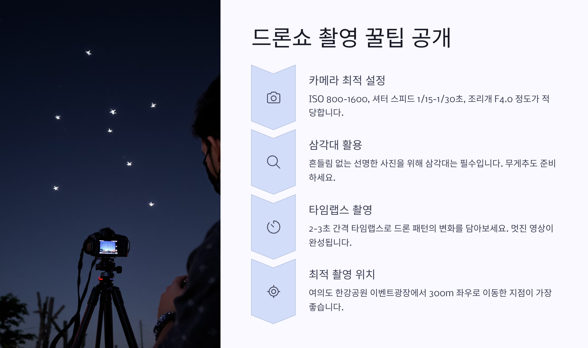 한강 드론쇼를 카메라나 스마트폰으로 멋지게 담고 싶다면 몇 가지 팁을 알아야 해요! 먼저, 플래시는 반드시 끄고 촬영해야 해요. 플래시가 켜지면 사진이 하얗게 떠버려요.