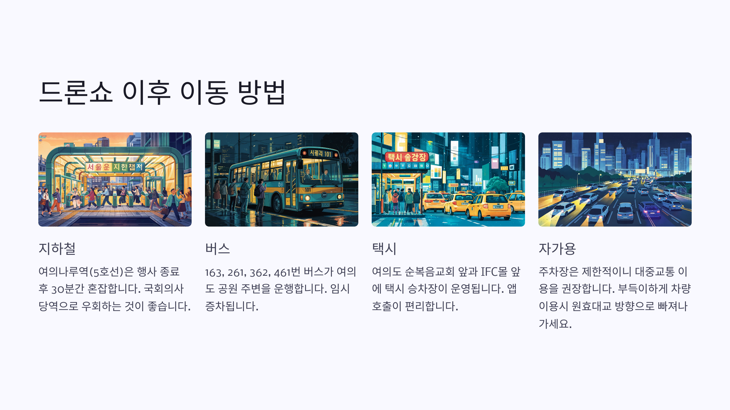 여의나루역, 샛강역은 드론쇼 직후 엄청 붐비니까, 한강 다리를 건너 노들역이나, 조금 더 먼 1호선 대방역으로 이동하는 것도 방법이에요.