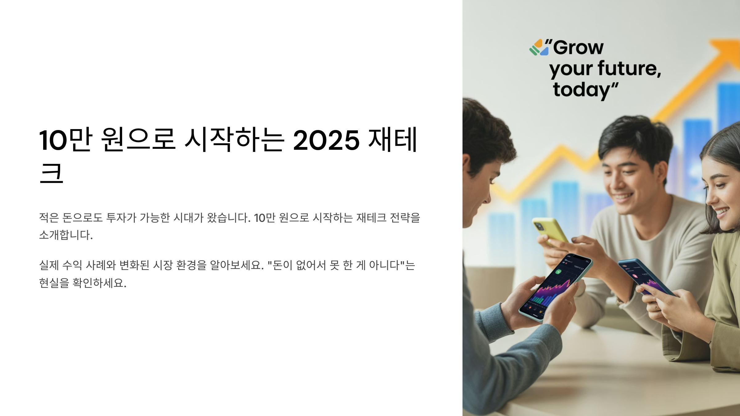 그럼 10만 원으로도 충분히 시작할 수 있는 재테크 방법을 알아보는 여정을 함께 떠나봐요! 지금부터 시작되는 본문은 5개 세션으로 나누어 자동 출력돼요. 다음 섹션에서 자세한 내용이 이어집니다.