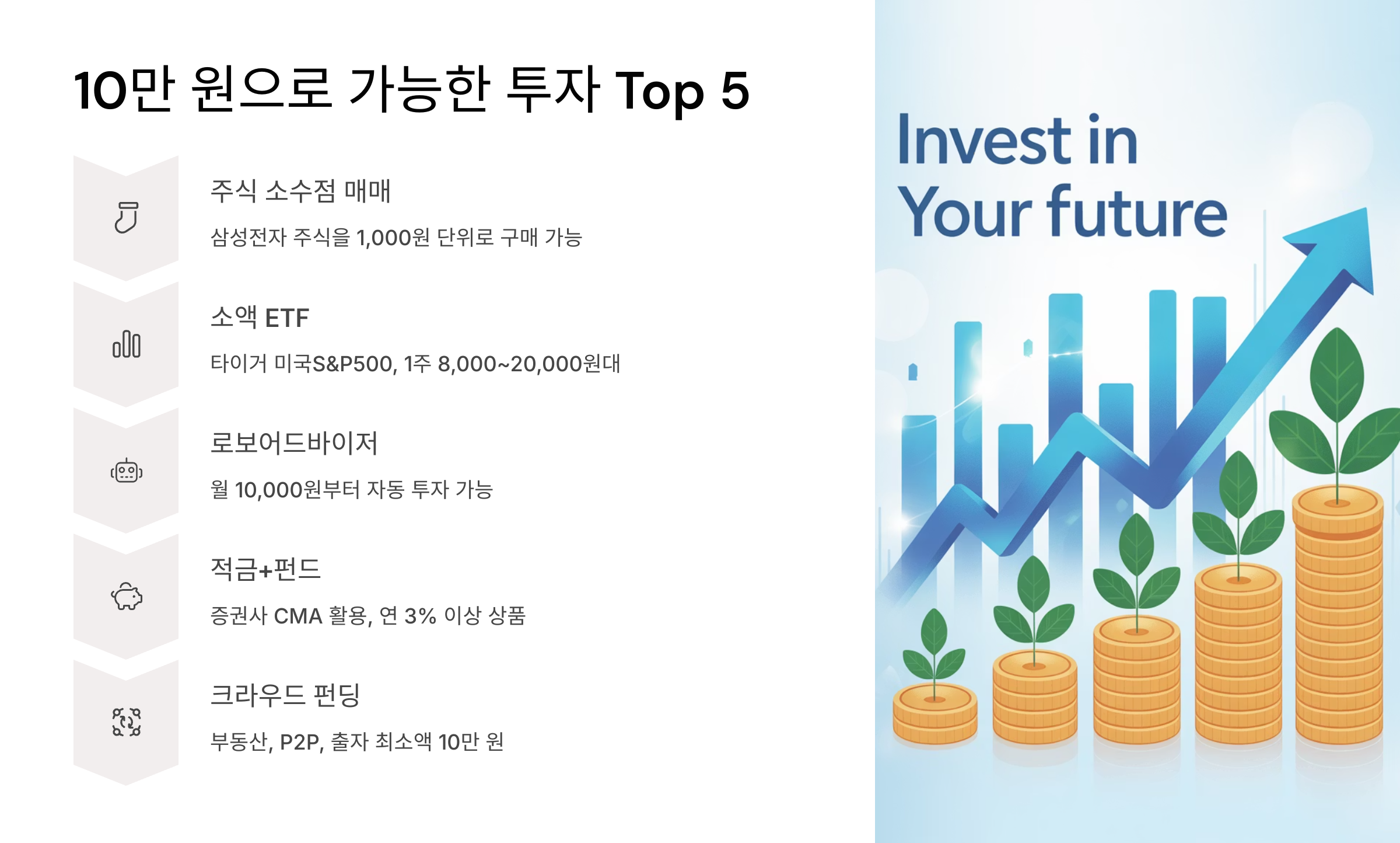 2025년 기준, 10만 원으로 시작할 수 있는 투자 방법은 정말 많아요. 중요한 건 그 돈을 어떻게 분산하고 전략적으로 쓰느냐예요. 너무 고위험 자산에 몰아 넣는 것보다는, 리스크는 낮추고 수익은 노릴 수 있는 방법을 찾는 게 핵심이죠. 그래서 지금부터 10만 원으로 할 수 있는 대표적인 투자 5가지를 알려드릴게요.