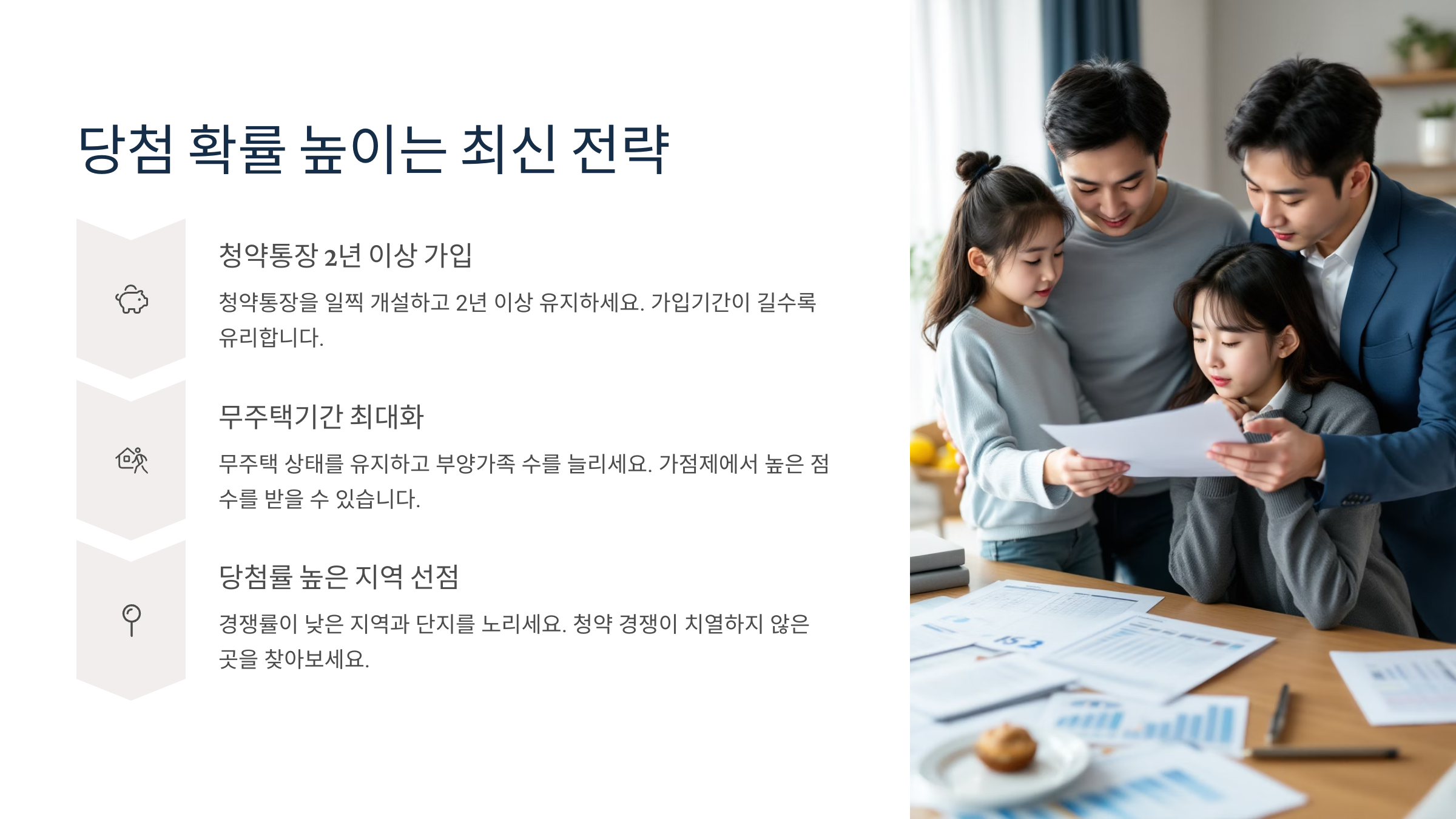 | 가점제 강화 | 무주택 10년 이상, 다자녀 | 납입 횟수+부양가족 가점 극대화 |