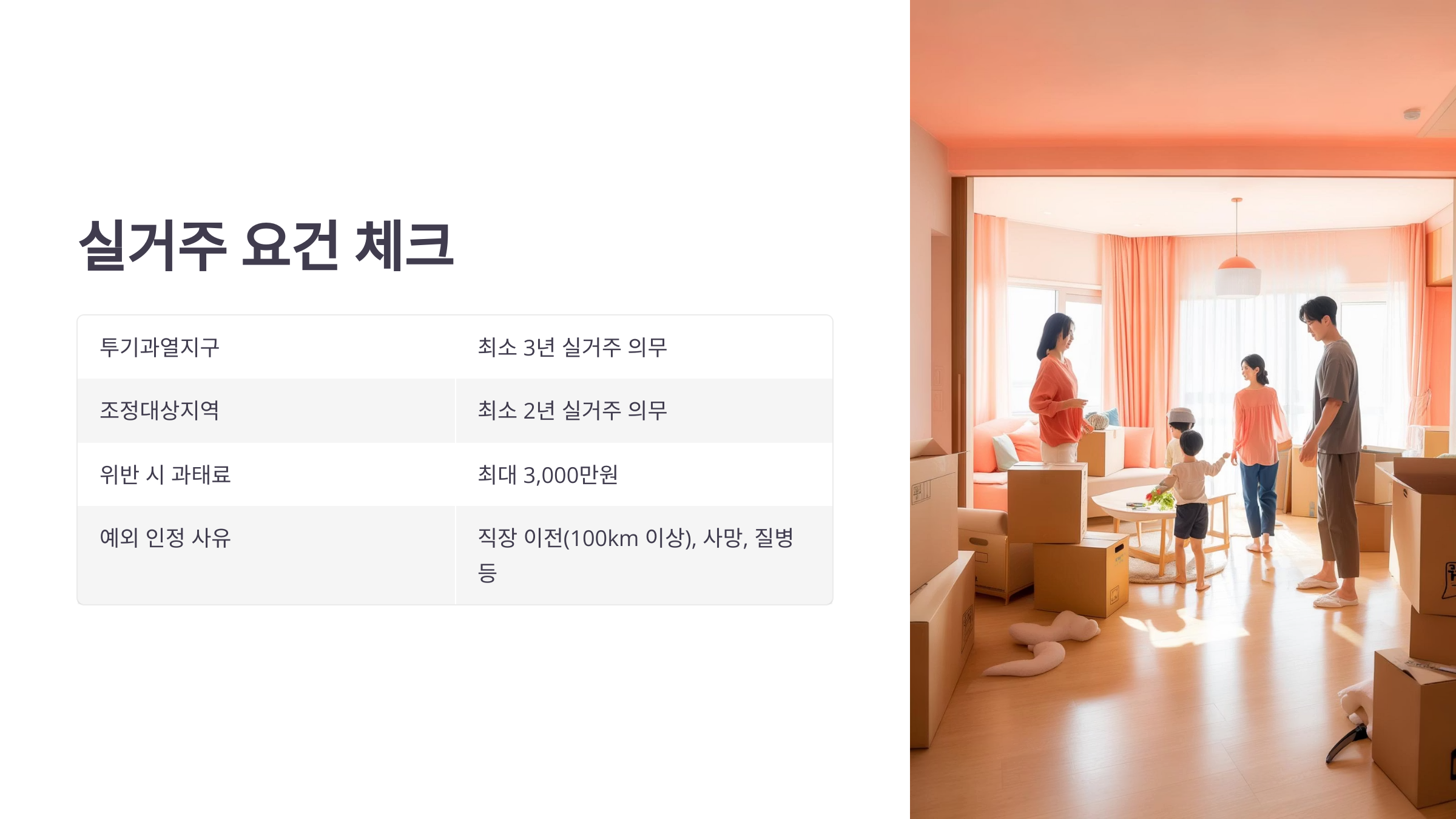 청약 당첨 후 입주까지의 과정에서 '실거주 요건'은 빠질 수 없는 핵심 포인트예요. 실거주 요건이 붙은 분양 단지는 실제로 해당 주택에 거주해야 하며, 이를 어기면 과태료 부과나 계약 해지까지 발생할 수 있어요.
