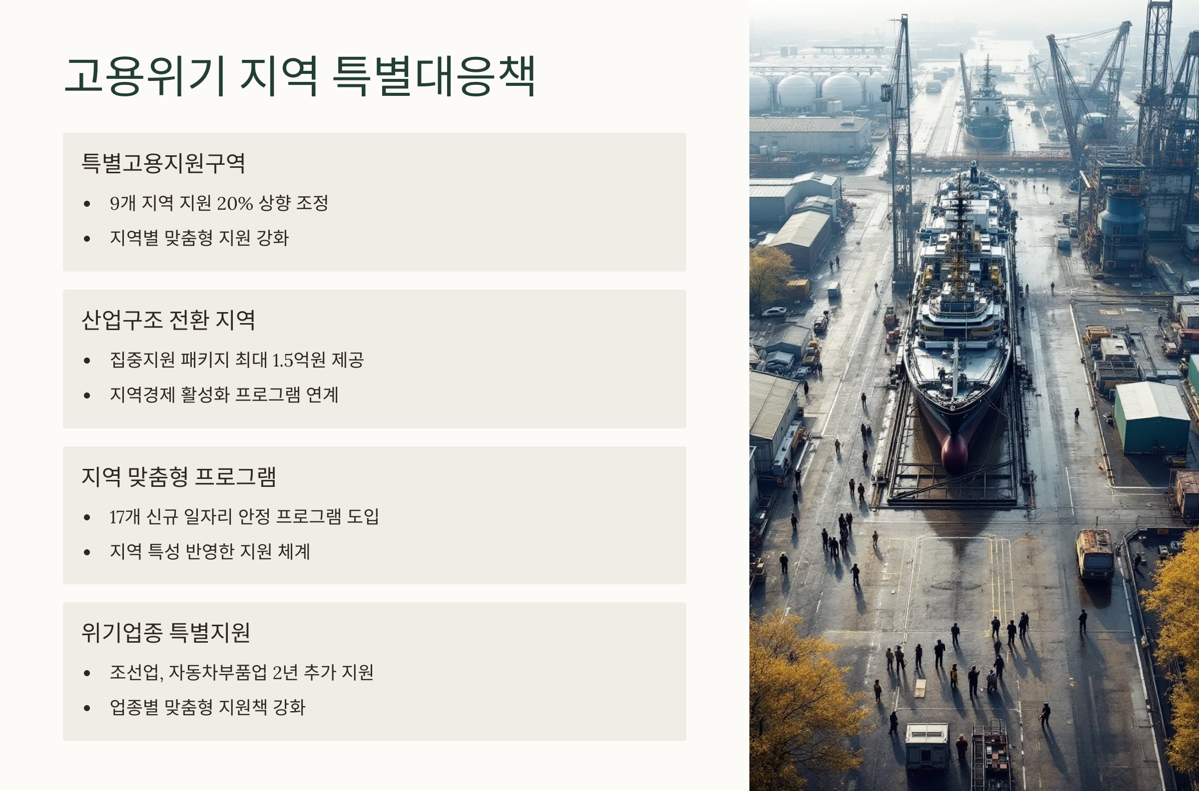 2025년에는 ‘고용위기 지역’에 대한 특별 대응도 강화됐어요. 전반적으로 일자리 안정자금 예산이 줄었지만, 특정 지역엔 예외적으로 더 많은 지원이 집중되고 있어요. 이건 지역 간 고용격차를 해소하려는 전략이에요.