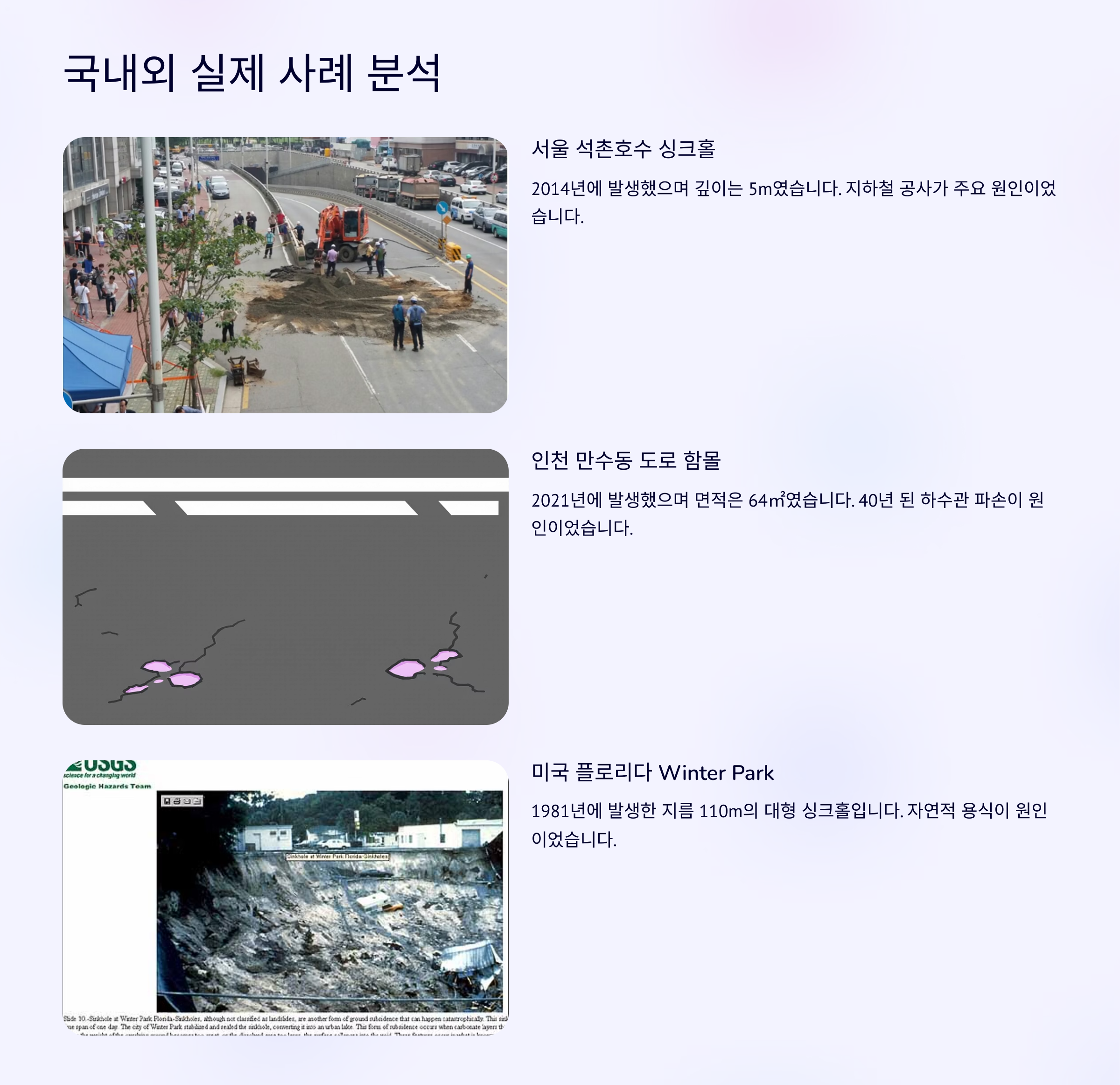 | 인공적 싱크홀 | 도시 지하 공간 붕괴 | 공사, 누수 | 도심 도로 |