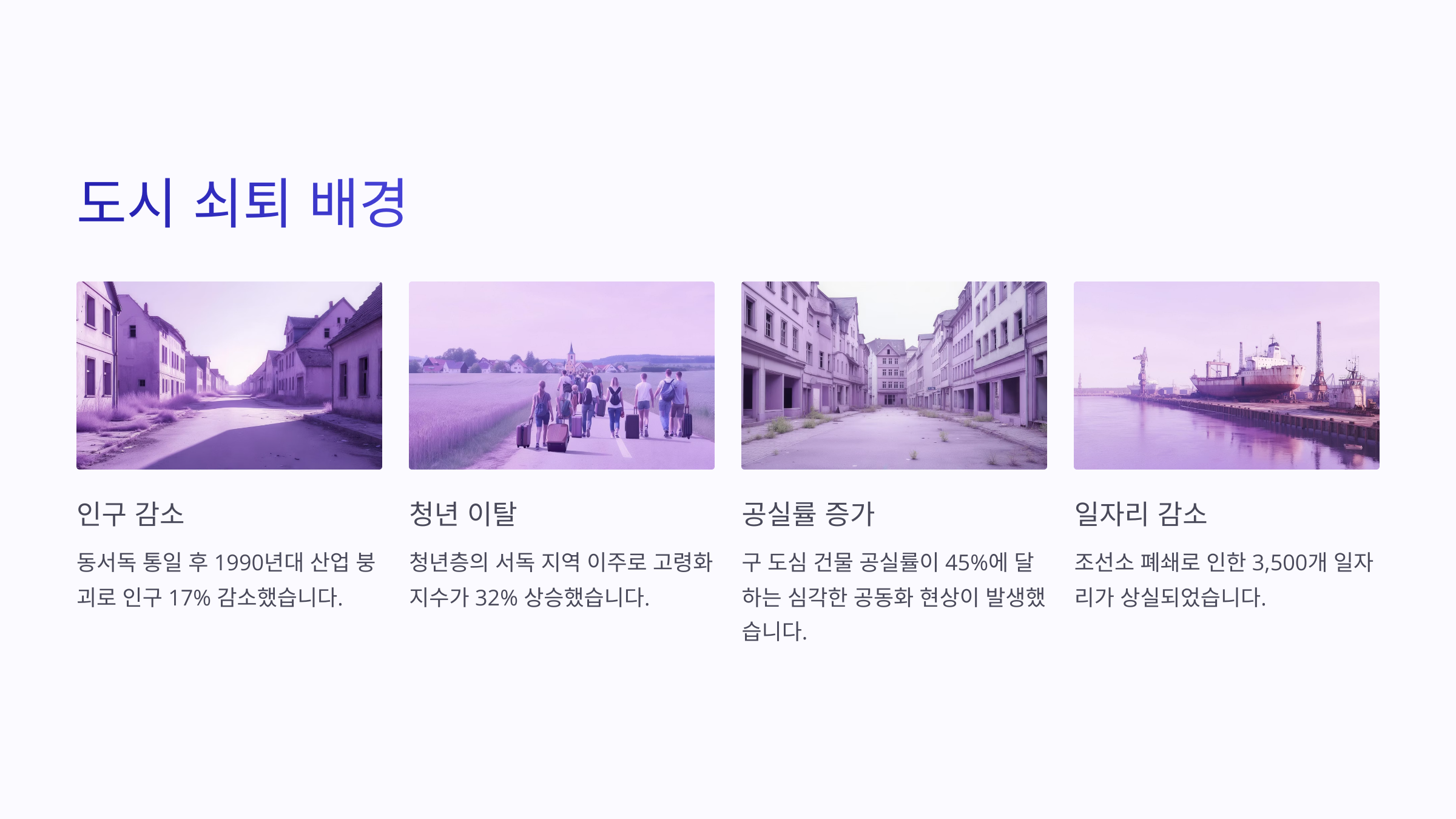 이 도시는 역사적인 건축물과 아름다운 해안 풍경으로 유명하지만, 1990년 독일 통일 이후 산업 기반이 무너지고 젊은 인구가 대거 대도시로 이주하면서 쇠퇴의 길을 걷게 됐어요. 많은 주거지와 상업 건물이 비게 되며 도시 전체에 활력이 사라졌죠.