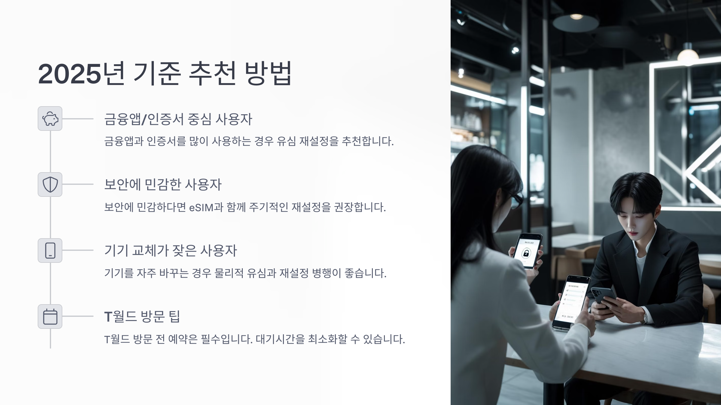 2025년 현재 기준으로, SKT 사용자에게 추천할만한 유심 관련 조치는 다음과 같아요. 보안을 강화하면서도 편리함을 추구하는 방향으로 정리했어요.
