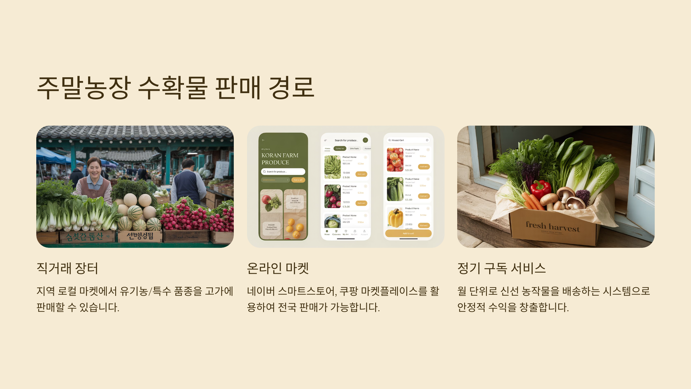 | 직거래 플랫폼 | 마켓컬리, 쿠팡 등 등록 | 소비자 확대 가능 |