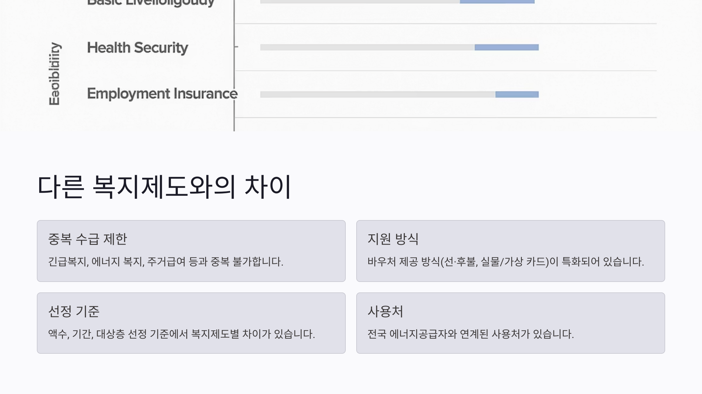 에너지바우처는 다른 복지제도와 달리 ‘에너지 사용에 직접 적용되는 실질 혜택’이에요. 주거나 식품 등 일반적인 복지와는 성격이 달라요. 사용자가 체감할 수 있는 금전적 혜택이 명확하다는 점이 특징이죠.
