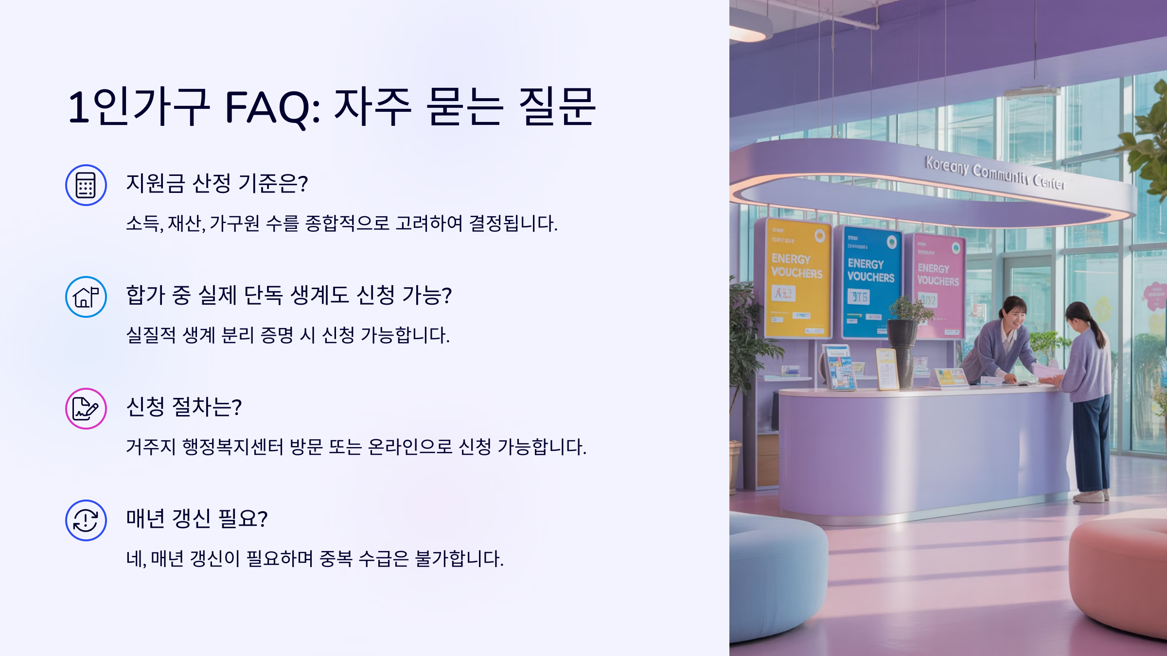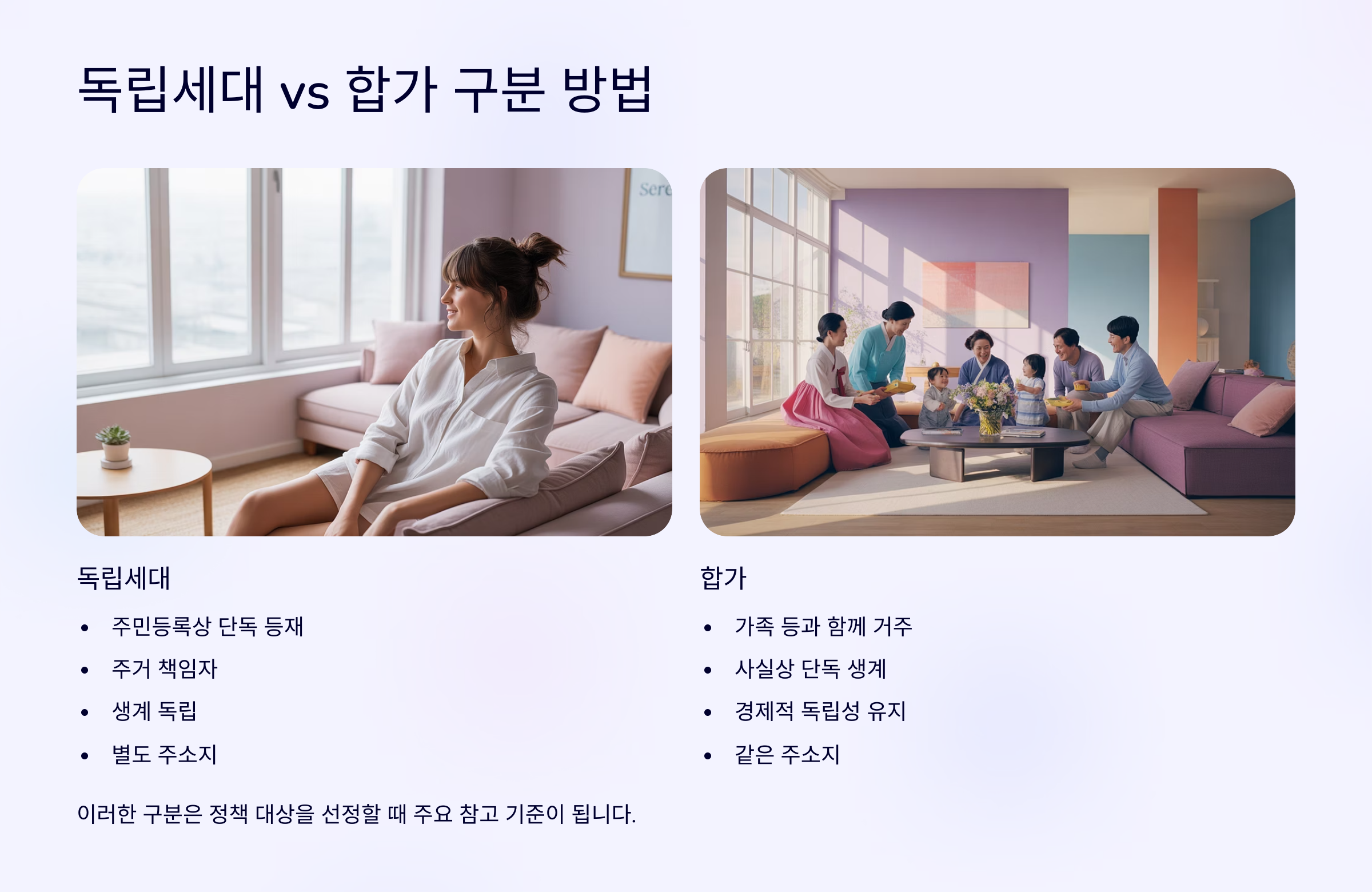 에너지바우처 신청에서 가장 혼란스러운 부분 중 하나는 1인가구와 합가 세대의 구분이에요. 주소가 같더라도 세대 분리가 돼 있으면 1인가구로 인정될 수 있어요. 🏠