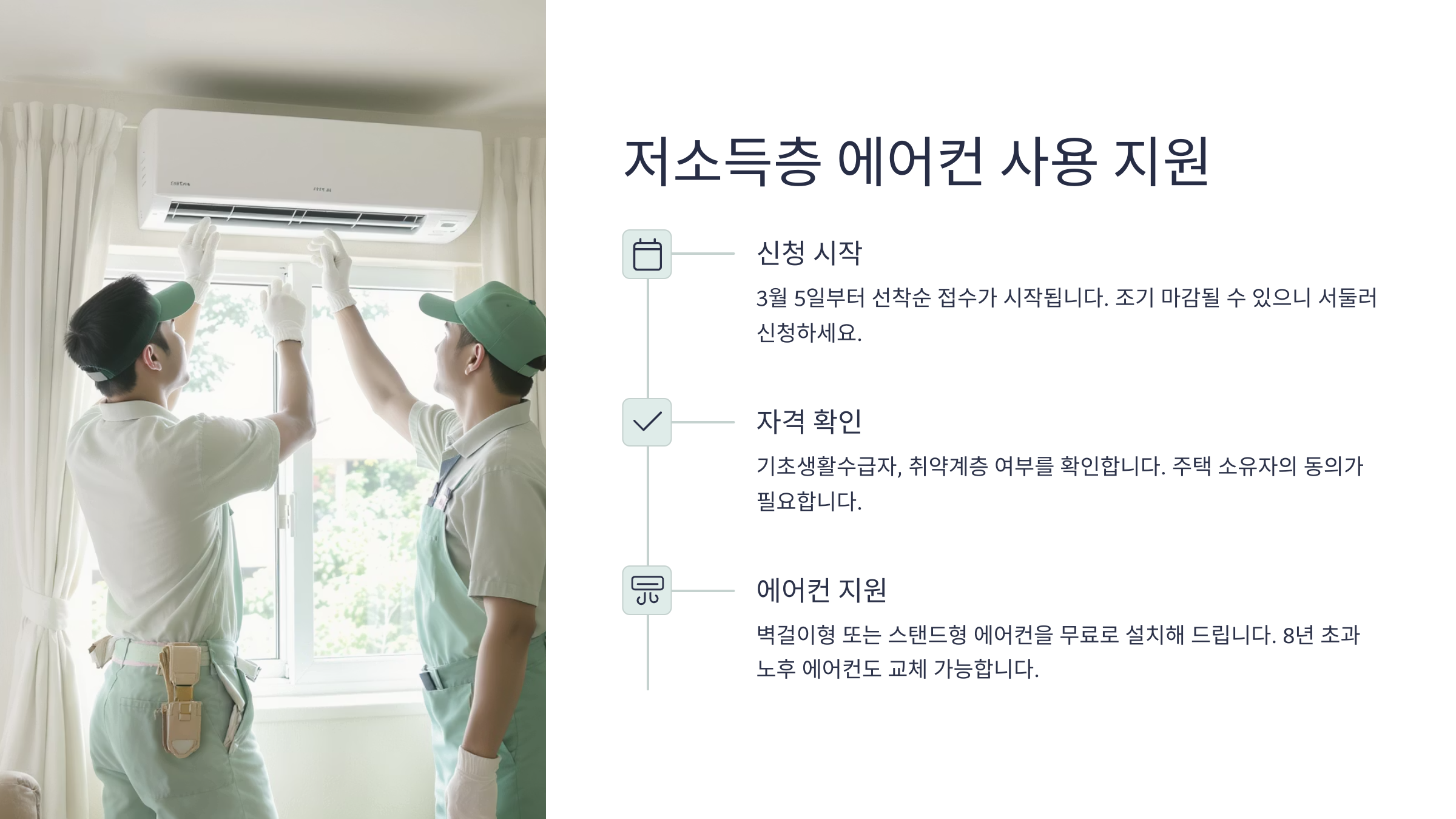 정부는 바우처와 함께 에어컨 보급사업도 함께 운영 중이에요. 특히 복지시설, 공동주택, 마을회관 등에 벽걸이형 냉방기를 무상 설치하거나 대여해주기도 해요. 사회복지관을 통해 신청할 수 있어요.
