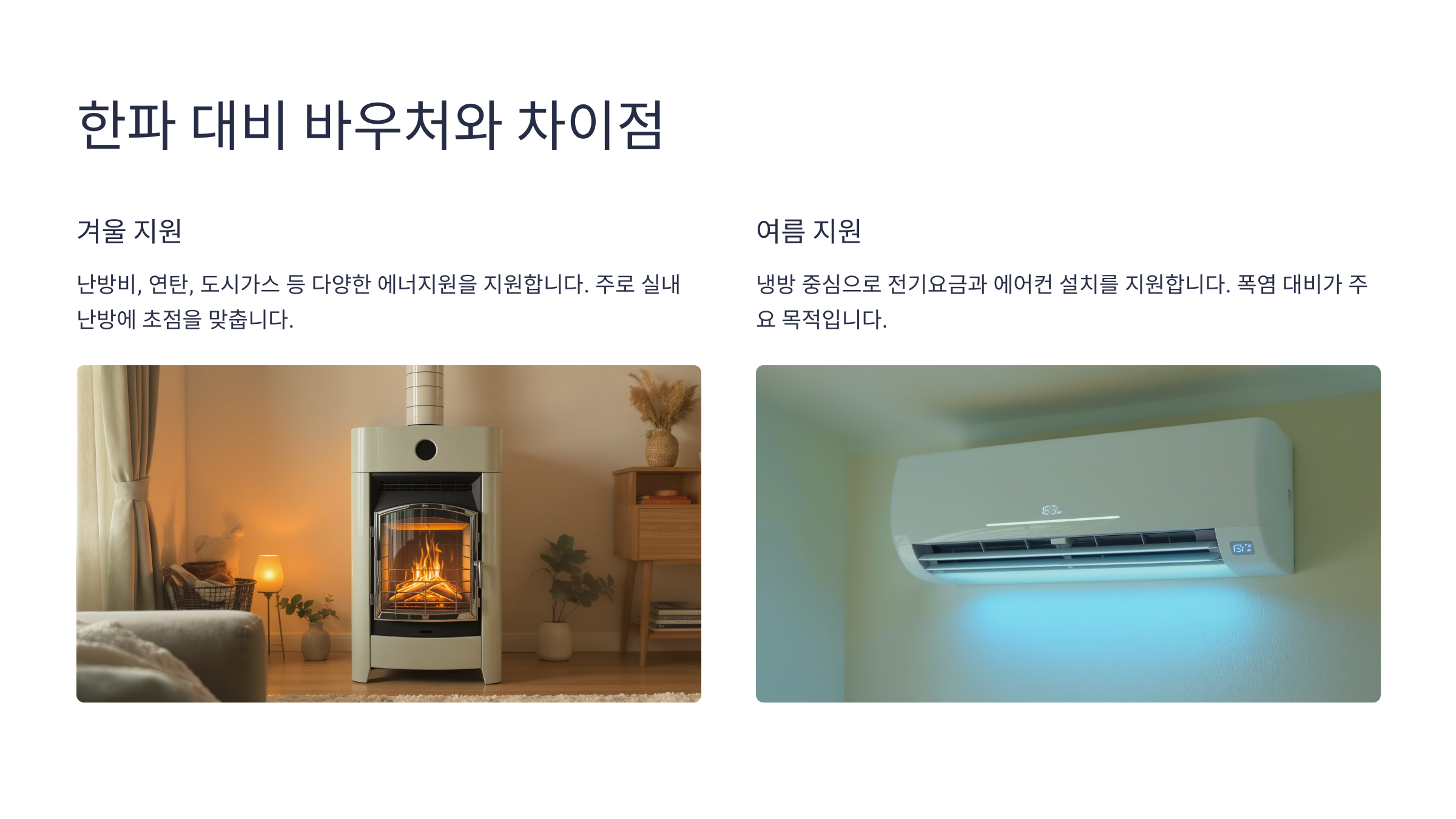 냉방용 바우처는 ‘겨울 난방용 바우처’와 몇 가지 큰 차이가 있어요. 두 제도 모두 에너지바우처지만 적용 방식과 금액, 사용 기간이 달라요. 혼동하지 않도록 아래 정리를 참고하세요. 🧊🔥