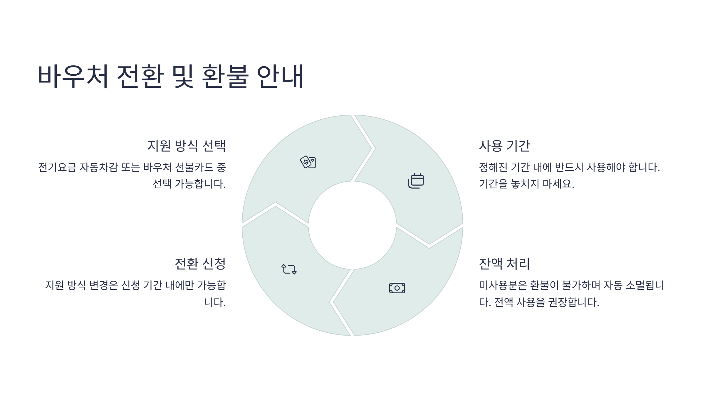 냉방비 바우처는 신청할 때 바우처를 다른 용도로 전환할 수 없어요. 예를 들어, 여름 전기로 신청했는데 나중에 가스로 바꾸는 건 불가능하답니다. ❌
