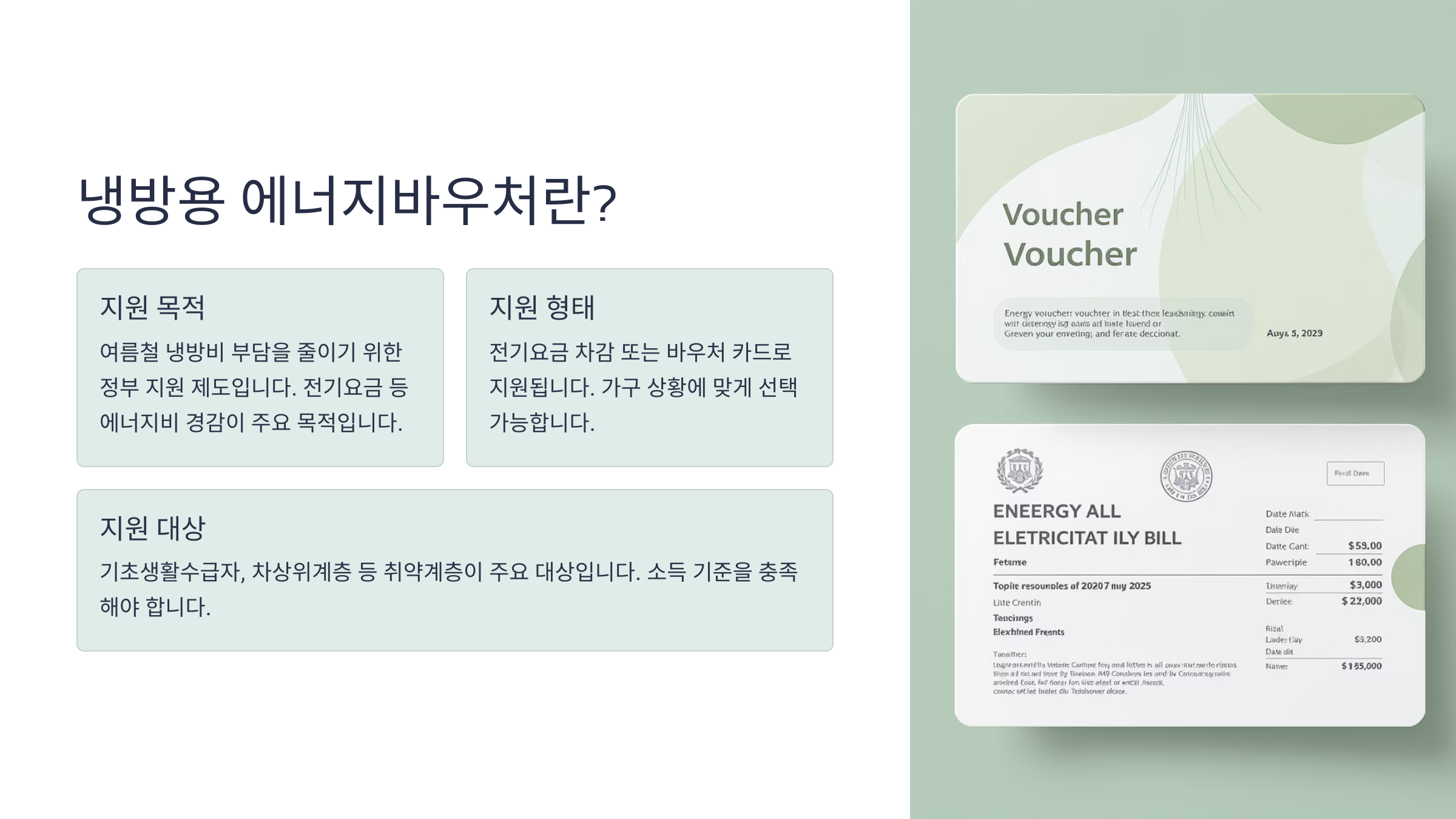 냉방용 에너지바우처는 정부가 저소득층의 여름철 전기요금 부담을 줄이기 위해 제공하는 계절성 에너지 지원금이에요. 쉽게 말해, 여름철 전기요금을 일정 부분 ‘자동으로 할인’해주는 복지 혜택이죠. 🧊