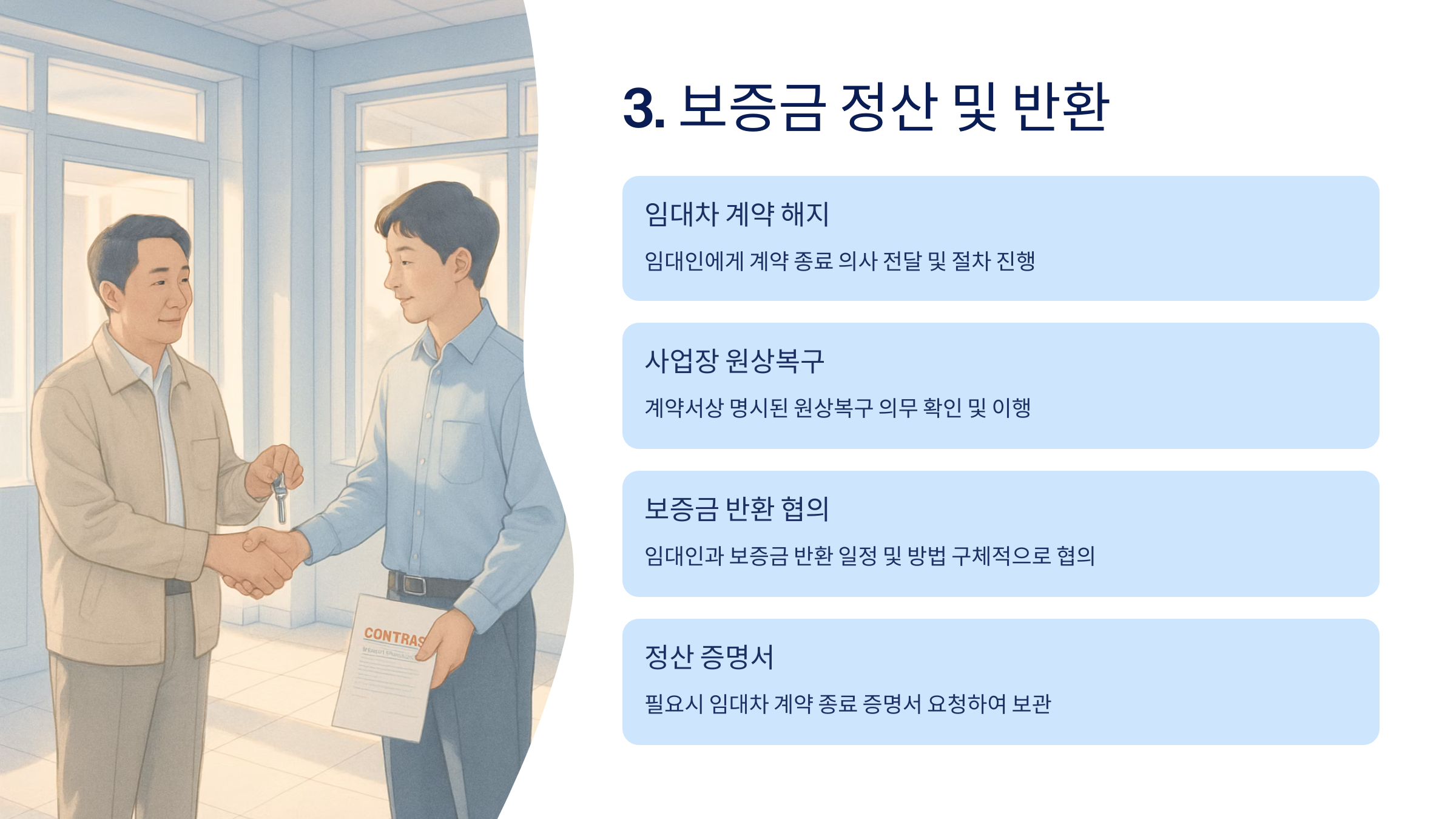 폐업 후 사업장에서 가장 신경 써야 할 부분 중 하나가 임대차 계약 종료와 보증금 반환이에요. 계약 종료 절차를 제대로 밟지 않으면 임대인과 갈등이 생기거나 보증금 반환이 지연될 수 있어요.