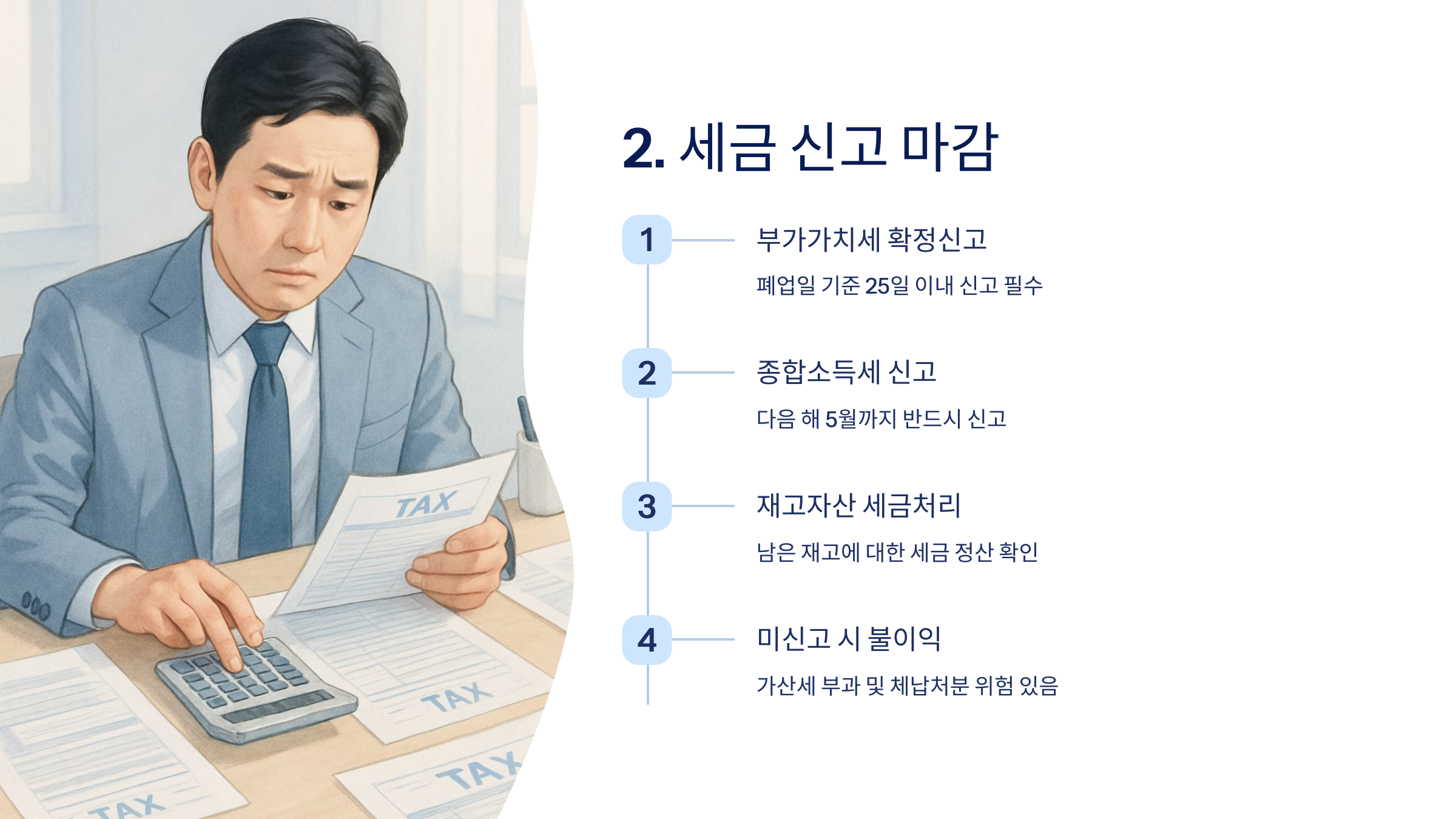 폐업을 했다고 해서 세금 신고 의무가 바로 끝나는 건 아니에요. 사업이 종료되더라도 마지막으로 부가가치세와 종합소득세를 신고해야 해요. 이 절차를 누락하면 가산세가 부과될 수 있어서 매우 주의해야 해요.
