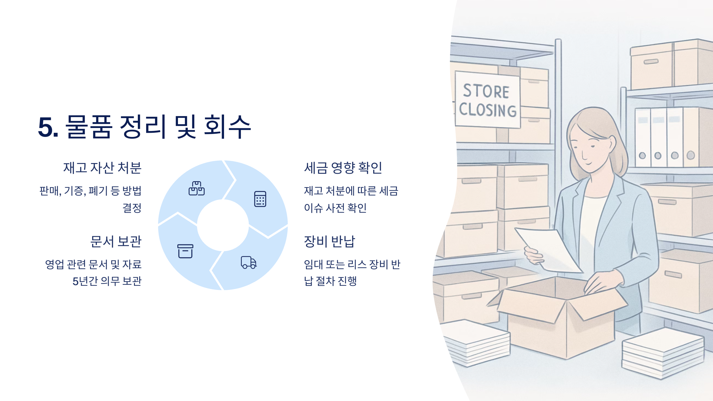 정리된 물품 리스트는 사진이나 엑셀로 기록해두면 나중에 필요 서류 제출 시 유용하고, 세무 신고 시 비용 처리 증빙으로도 활용할 수 있어요. 깔끔한 정리는 다음 사업을 위한 첫걸음이에요!