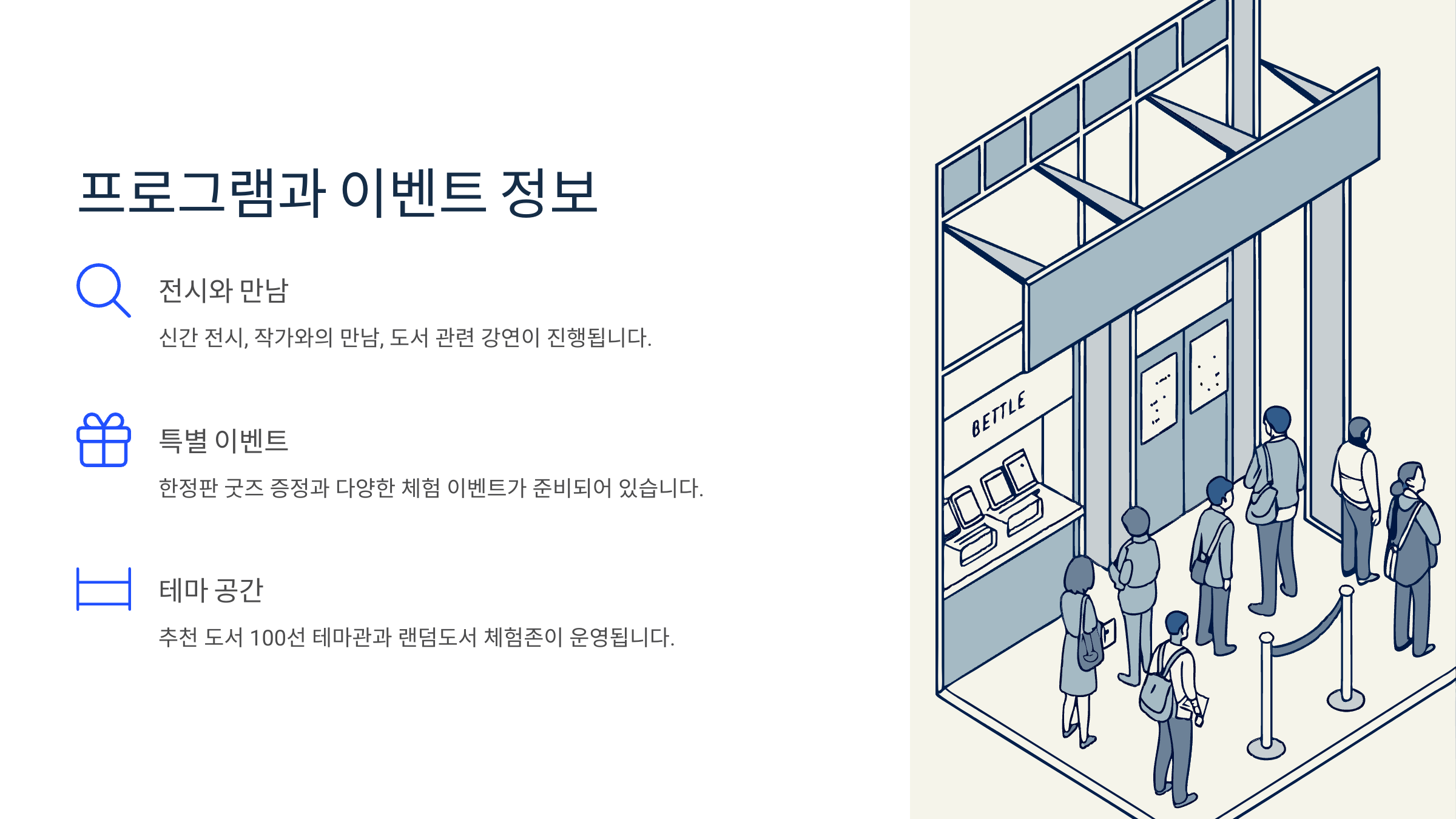 그럼 다음으로는 이 도서전에서 어떤 프로그램과 이벤트가 열리는지 살펴볼까요? 🎤