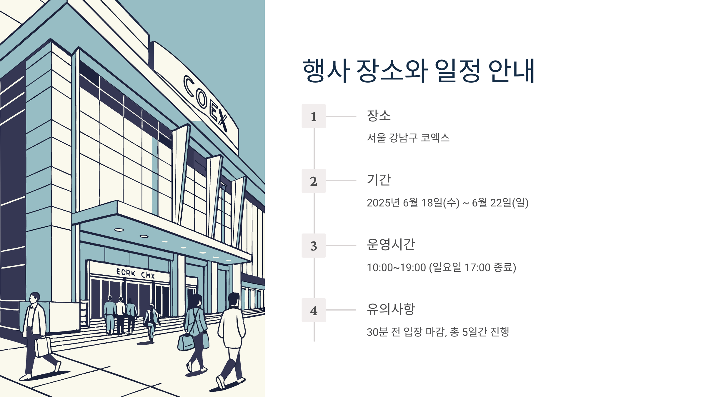 결론적으로, 2025년 도서전의 콘셉트는 ‘책이라는 콘텐츠가 어떻게 더 넓게 확장될 수 있는가?’에 대한 대답이에요. 주제에서 말하듯, 책은 경계를 넘어서는 힘을 가지고 있어요. 📗 이제 도서전의 일정과 장소도 알아볼까요?
