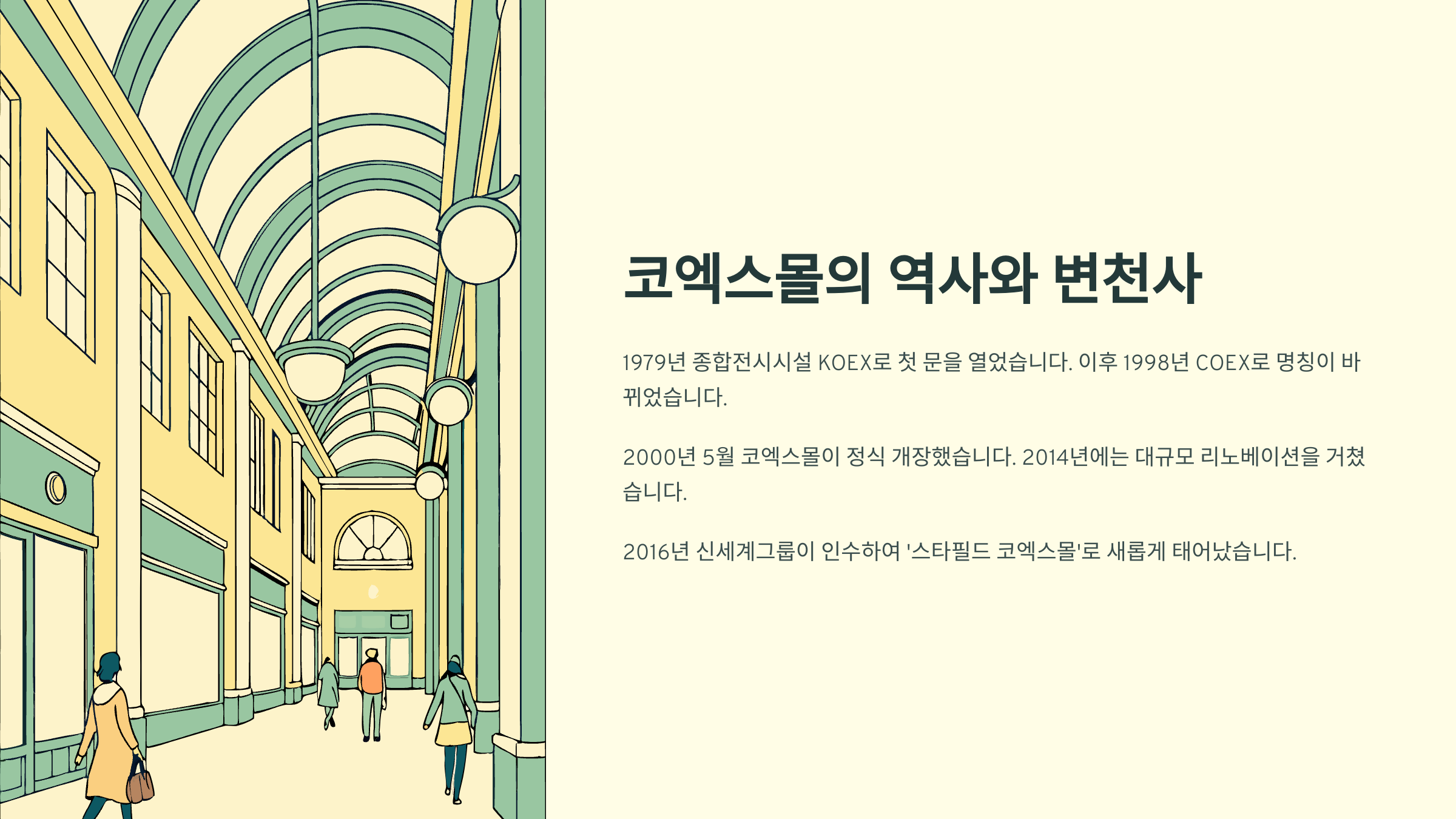 이어서 코엑스몰의 역사부터 가장 인기 있는 공간까지, 순서대로 재미있고 유익하게 안내할게요! 🗺️