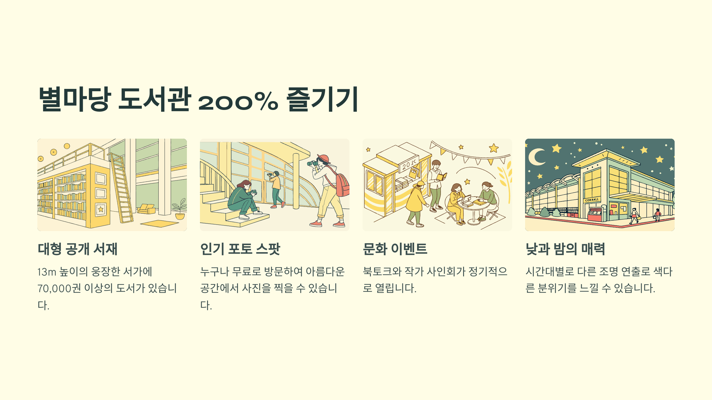 그럼 이제 배도 불렀겠다, 책과 예술을 느낄 수 있는 공간으로 이동해볼까요? 다음은 ‘별마당 도서관 200% 즐기기’예요! 📚