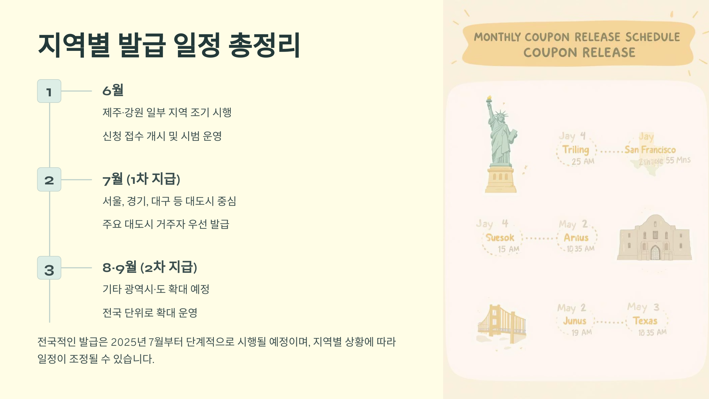 자, 이제 가장 중요한 발급 일정을 정리해볼게요. 아래는 2025년 상반기 기준으로 각 지자체에서 공지한 주요 소비쿠폰 발급 시기예요. 하반기 일정은 추석 전후로 다시 공지될 예정이니 참고해 주세요.