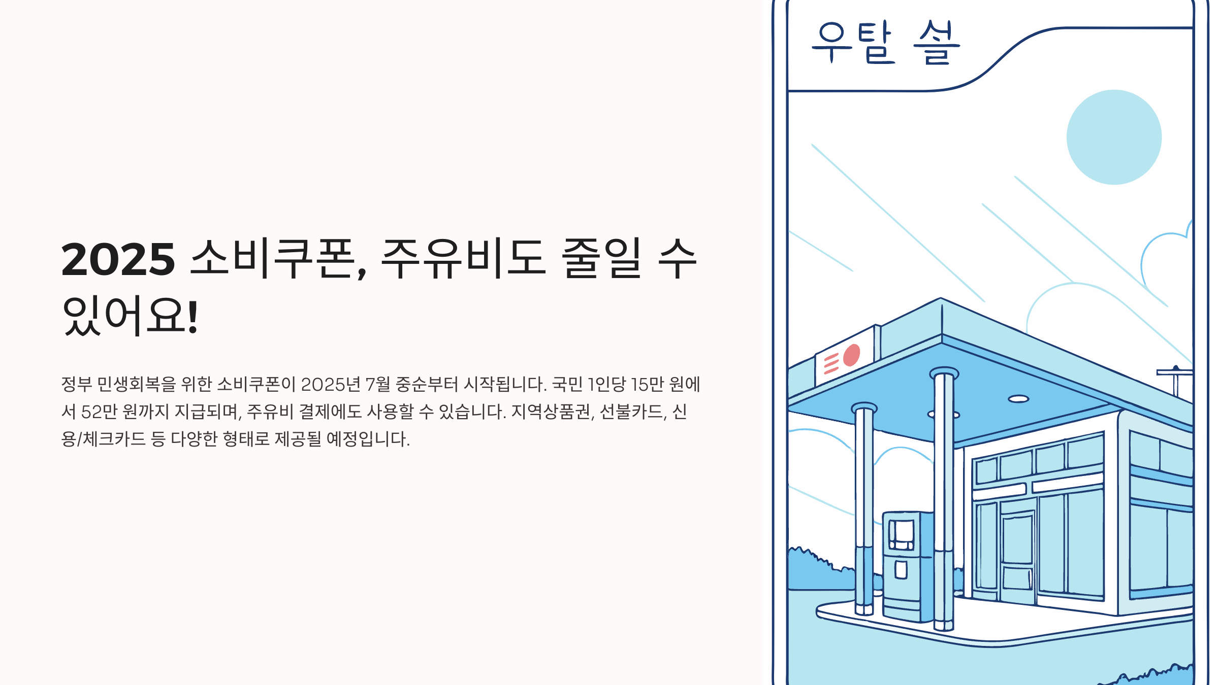 주유소 선택만 잘해도 소비쿠폰 혜택을 극대화할 수 있어요. 기름값도 절약하고, 포인트도 쌓고, 캐시백까지! 이젠 똑똑하게 주유할 차례예요. ⛽💳