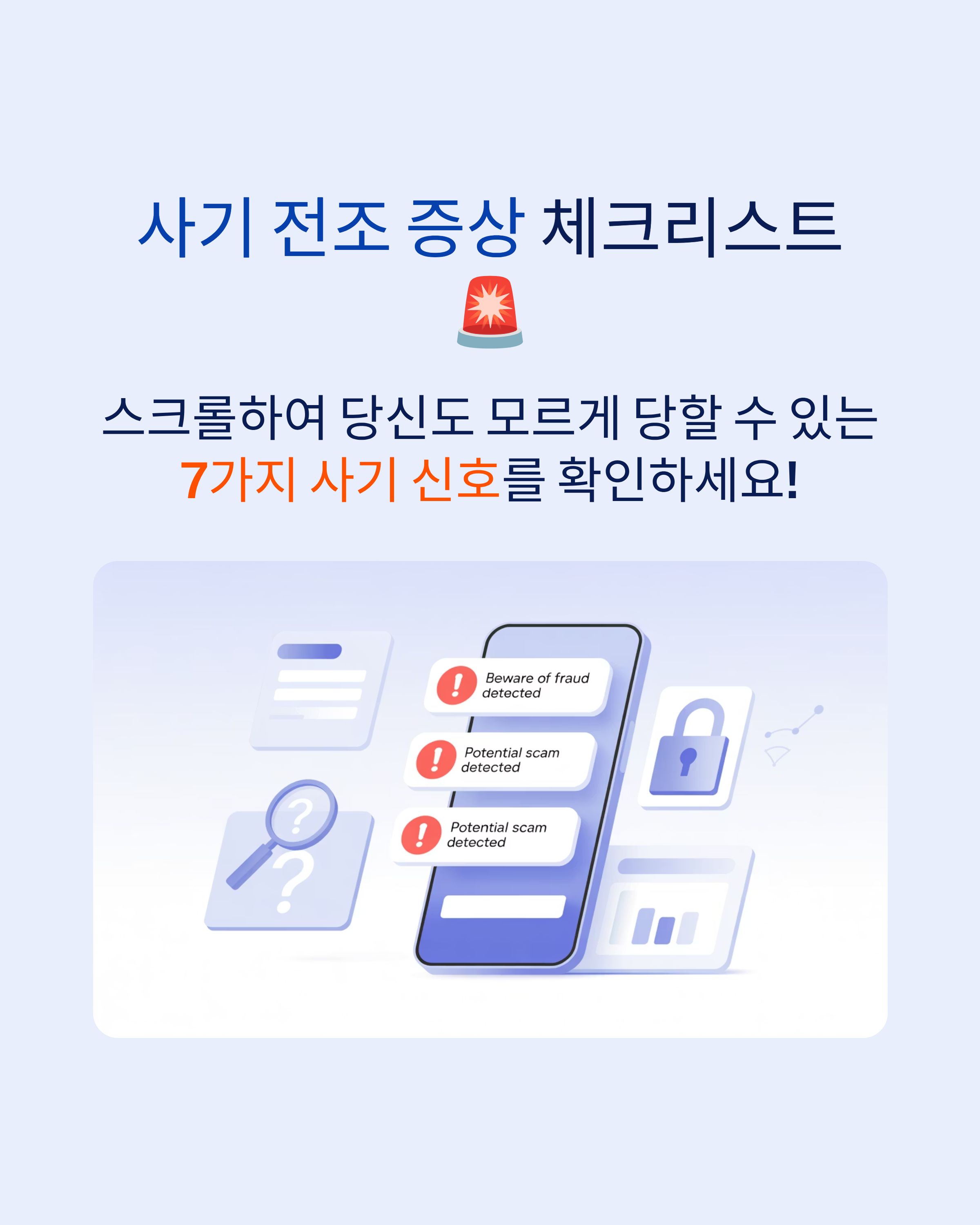 사기 피해는 한순간에 발생하지 않아요. 대부분 초기 단계에서 전조 증상이 나타나고, 이를 무시하거나 알아차리지 못해 피해로 이어지죠. 오늘은 대표적인 사기 전조 신호 3가지와 이를 조합했을 때 위험도가 왜 폭발적으로 높아지는지 알려드릴게요.